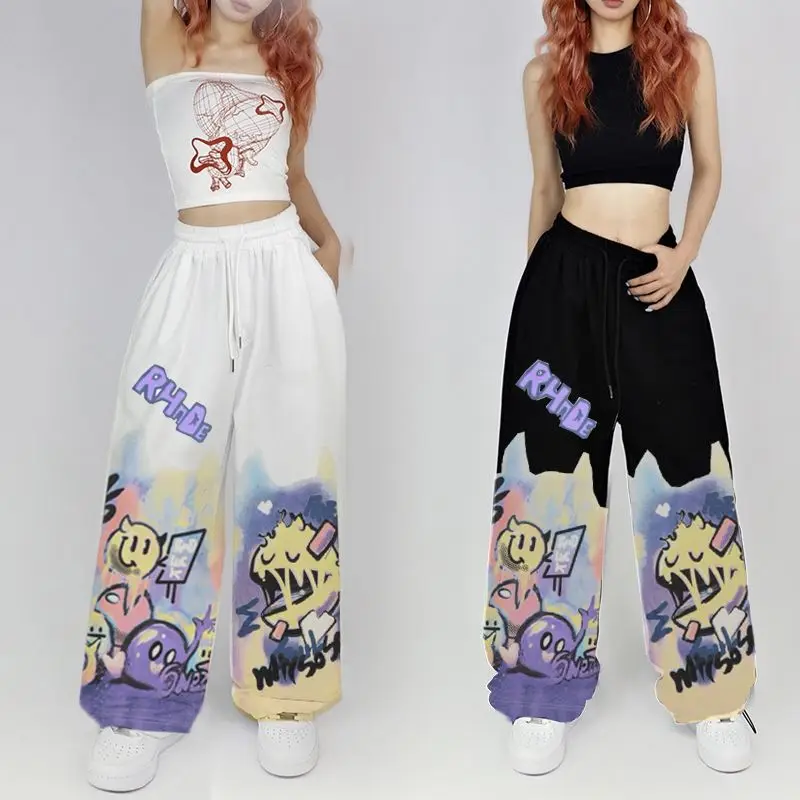 American Street Hip Hop Straight Graffiti Casual Pants New Fashion Casual High Waist Pockets Jazz Dance Sports Wide Leg Trousers