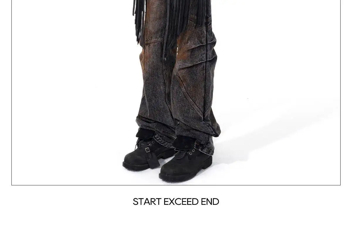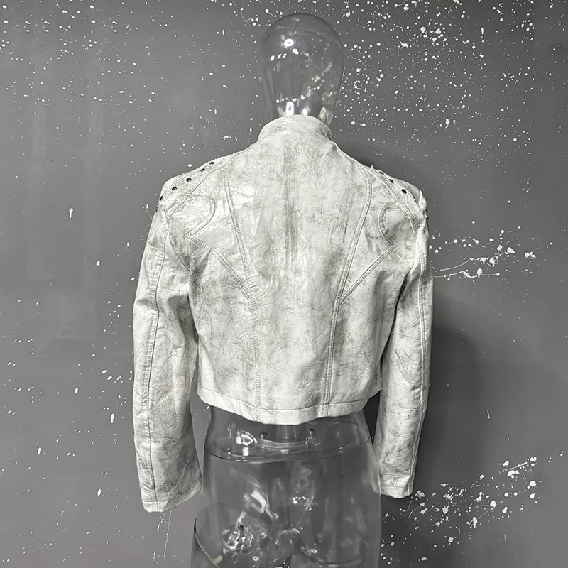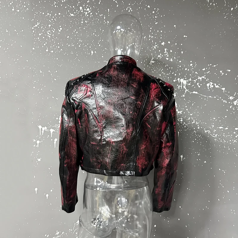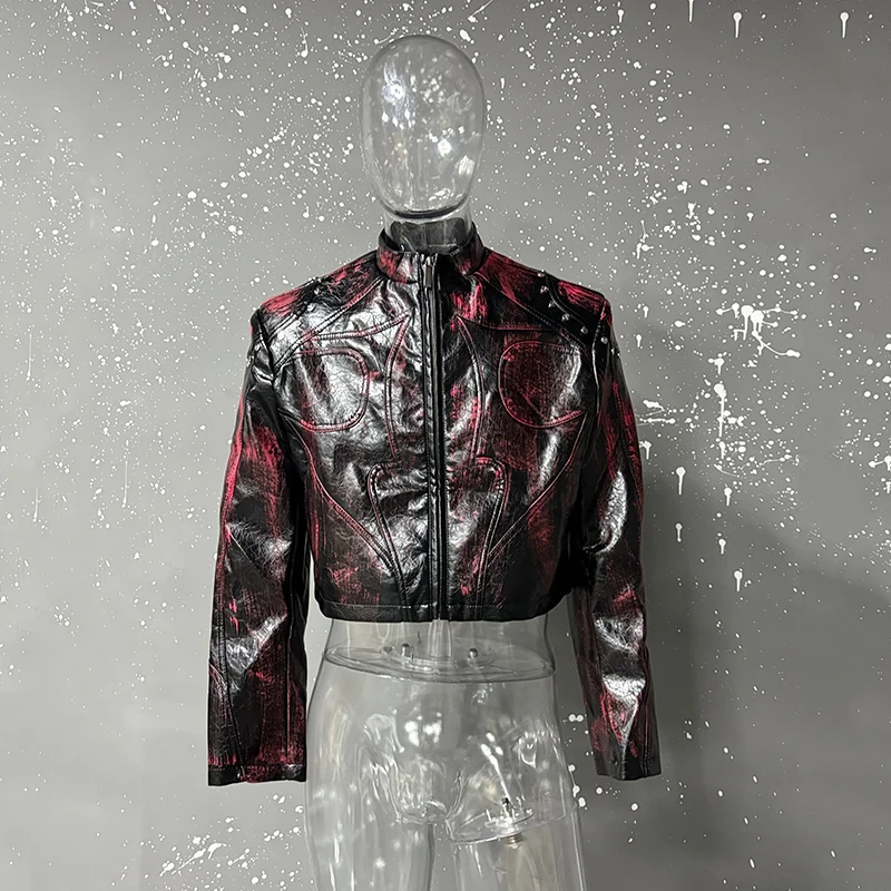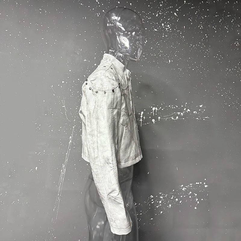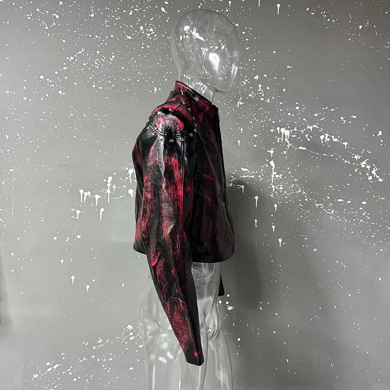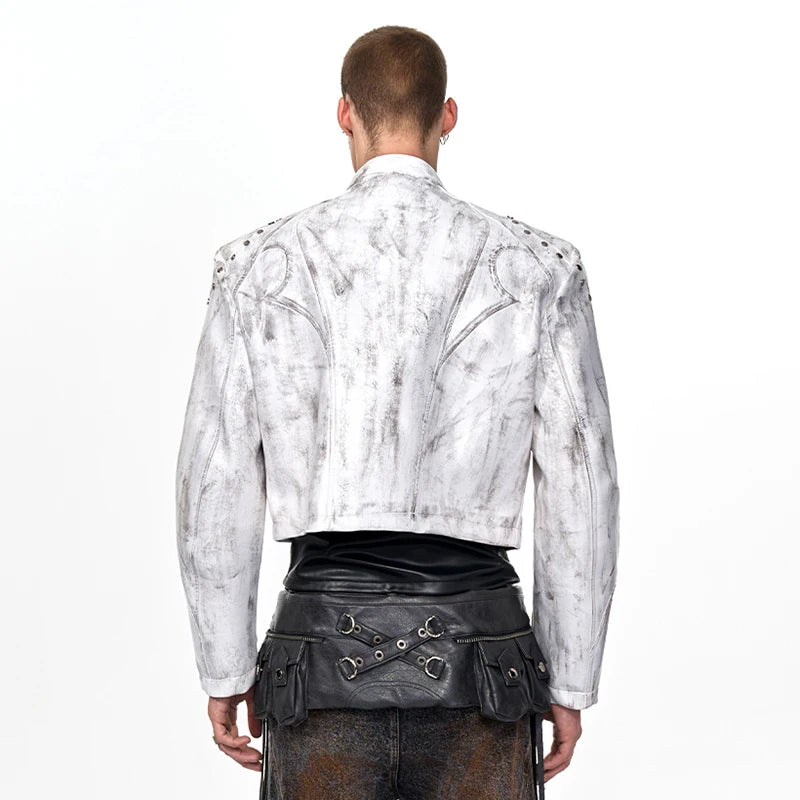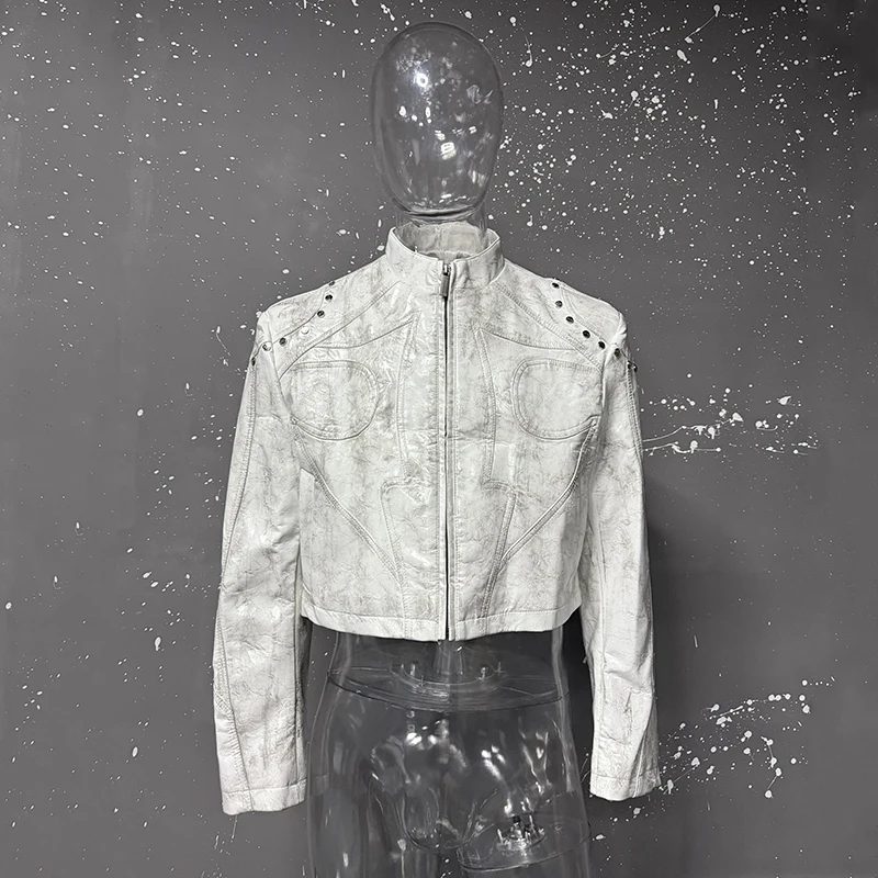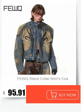 FEWQ High Street Men's PU Leather Jackets Stand Collar Shoulder Pads Dirty-dying Contrast Color Loose Male Short Coats 24K5621