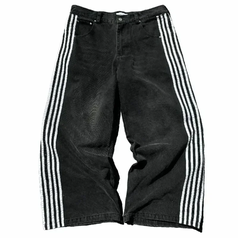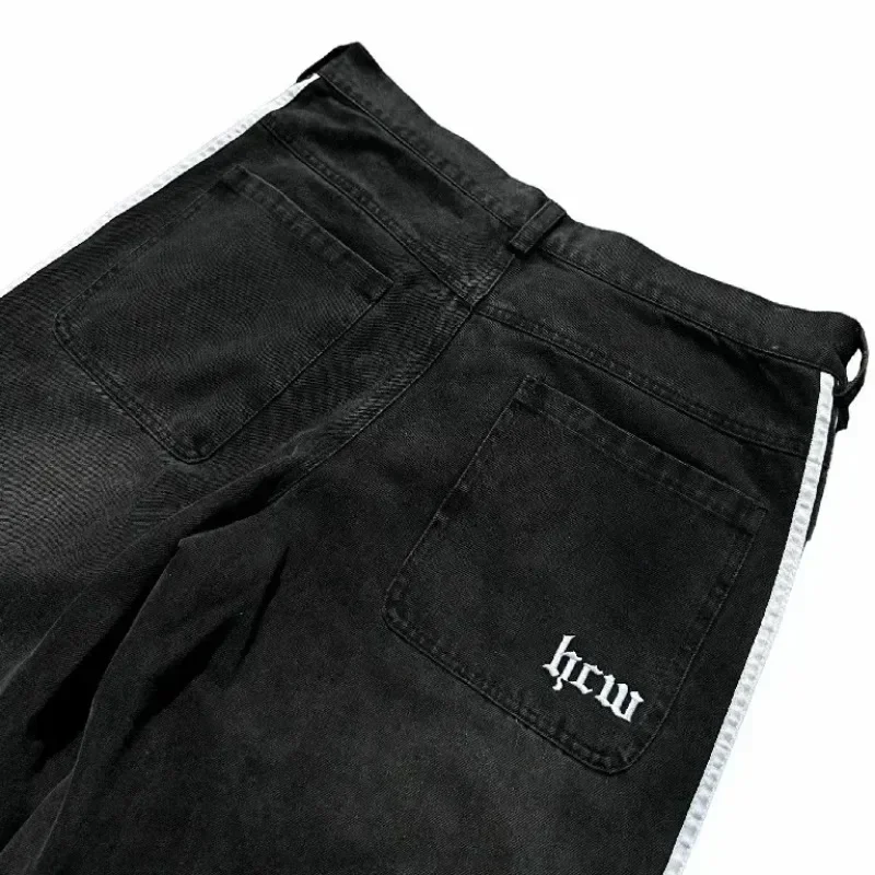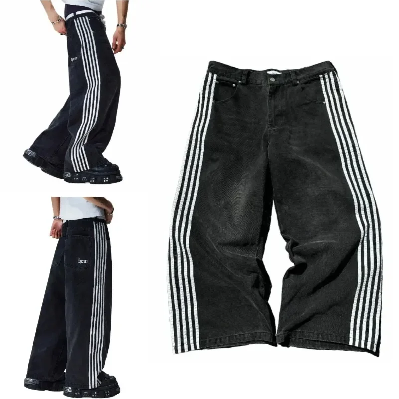 Harajuku Retro Hip Hop Mens Jeans Y2k Black Striped Baggy Jeans Gothic Embroidered Wide Leg Denim Pants High Street Streetwear