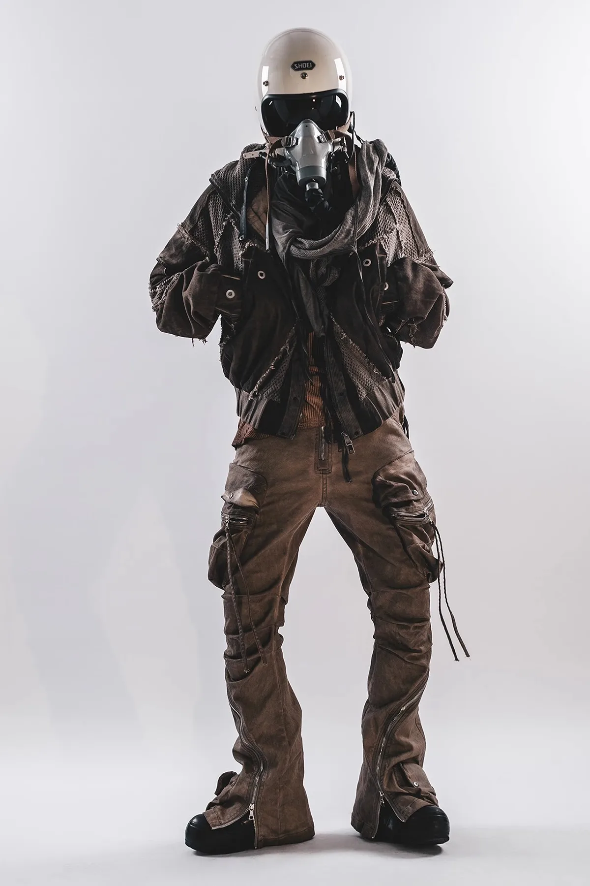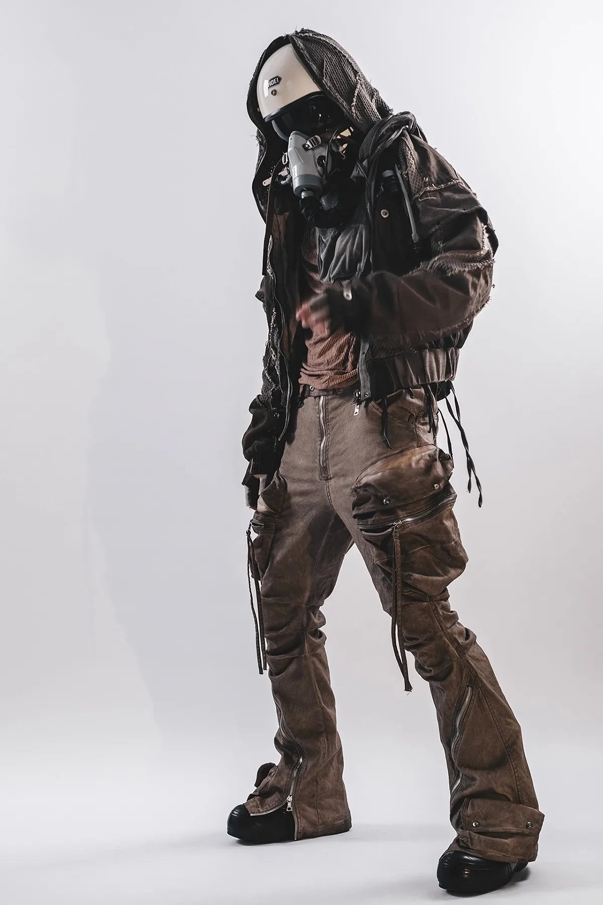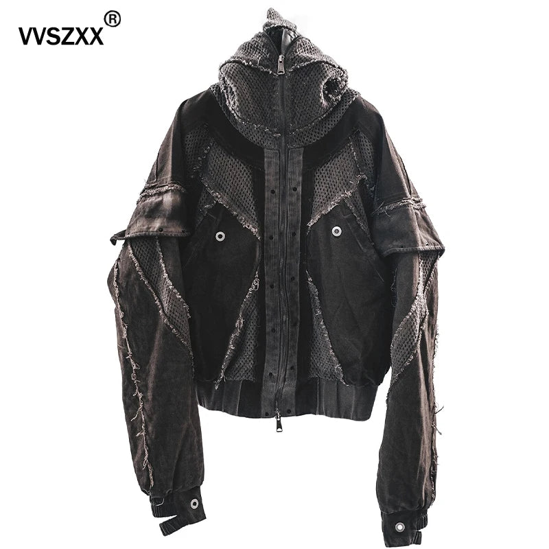 Waste Soil Style Men Stereoscopic Cut Mesh Splicing Hooded Short Jacket Washed Distressed Coat Men