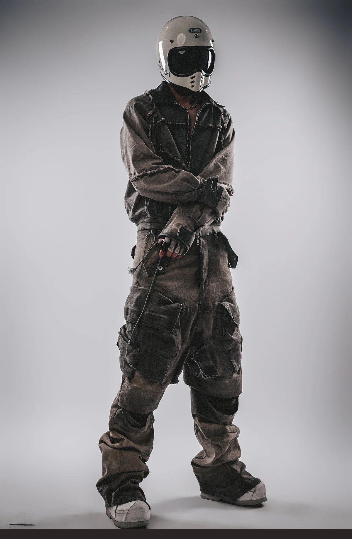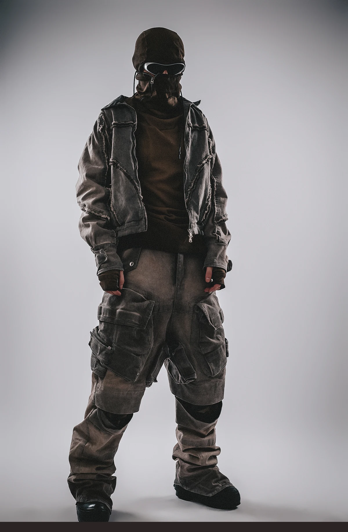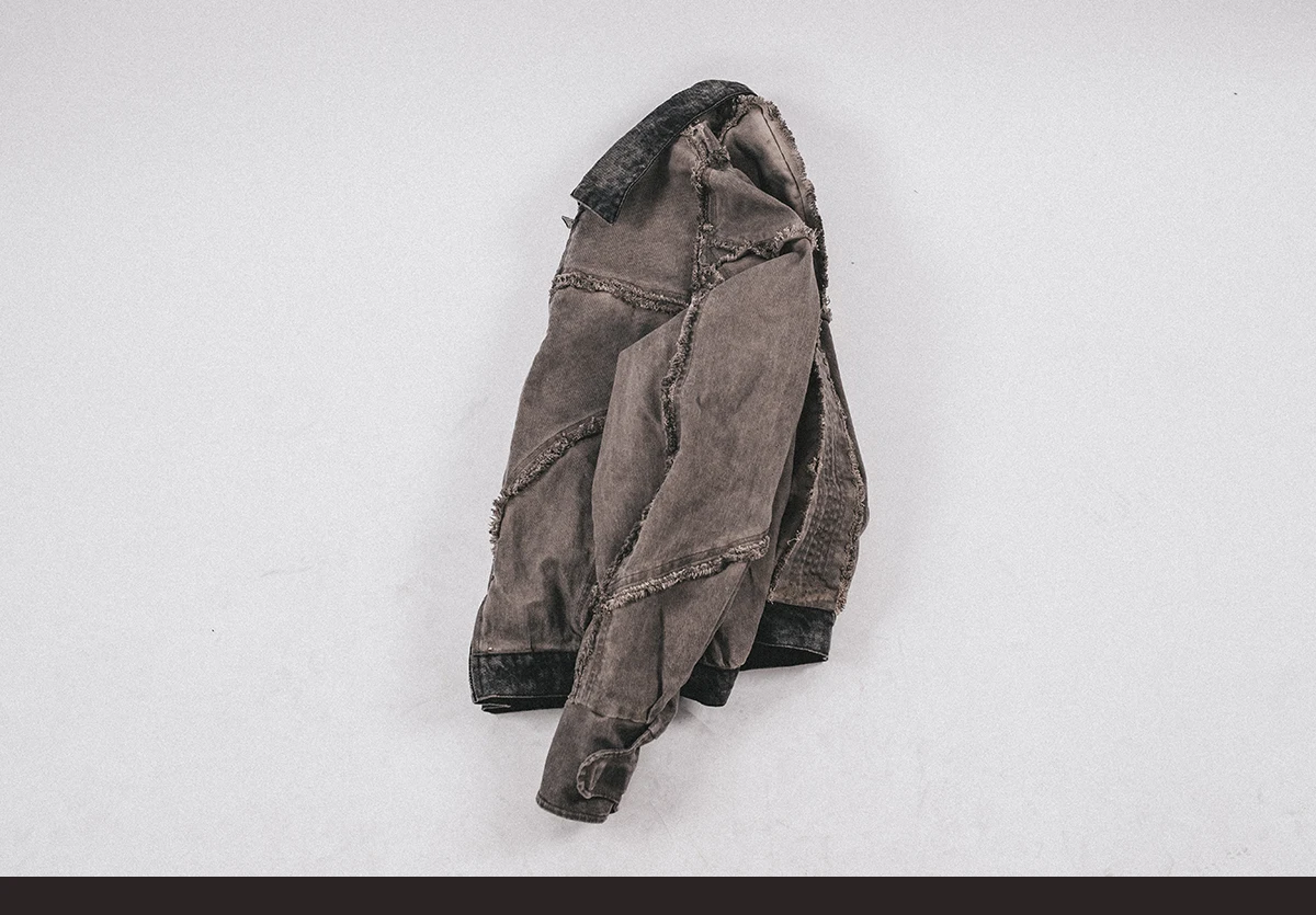 Waste Soil Style Washed Frayed Rough Edge Short Jacket Men Profile Distressed Flip Collar Coat