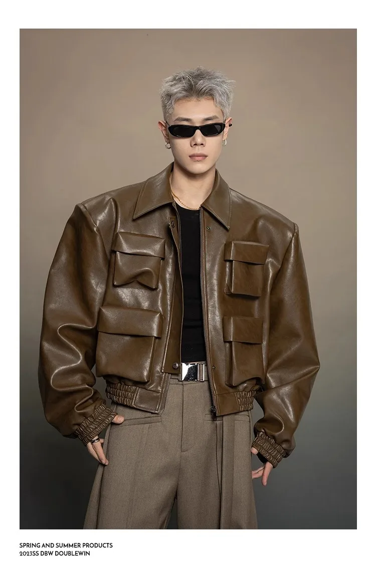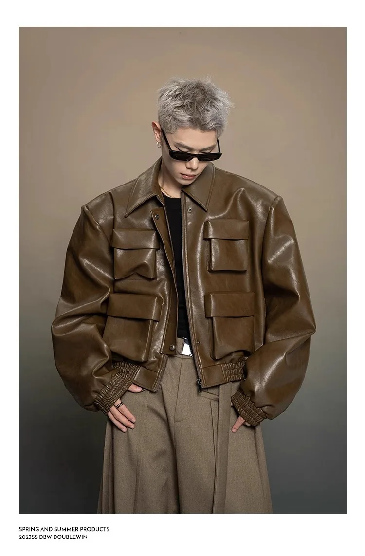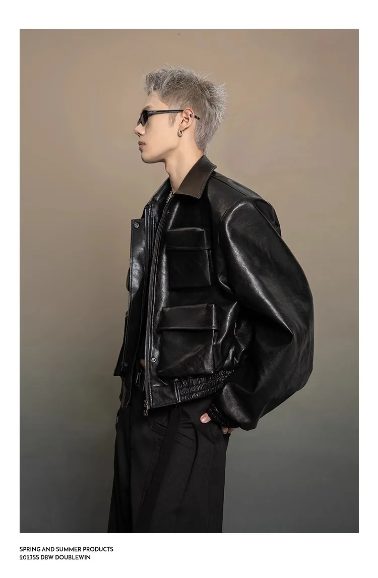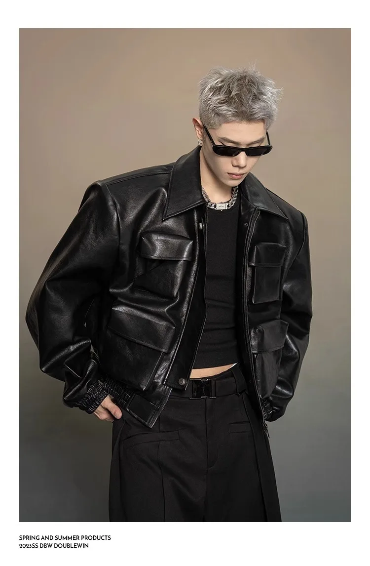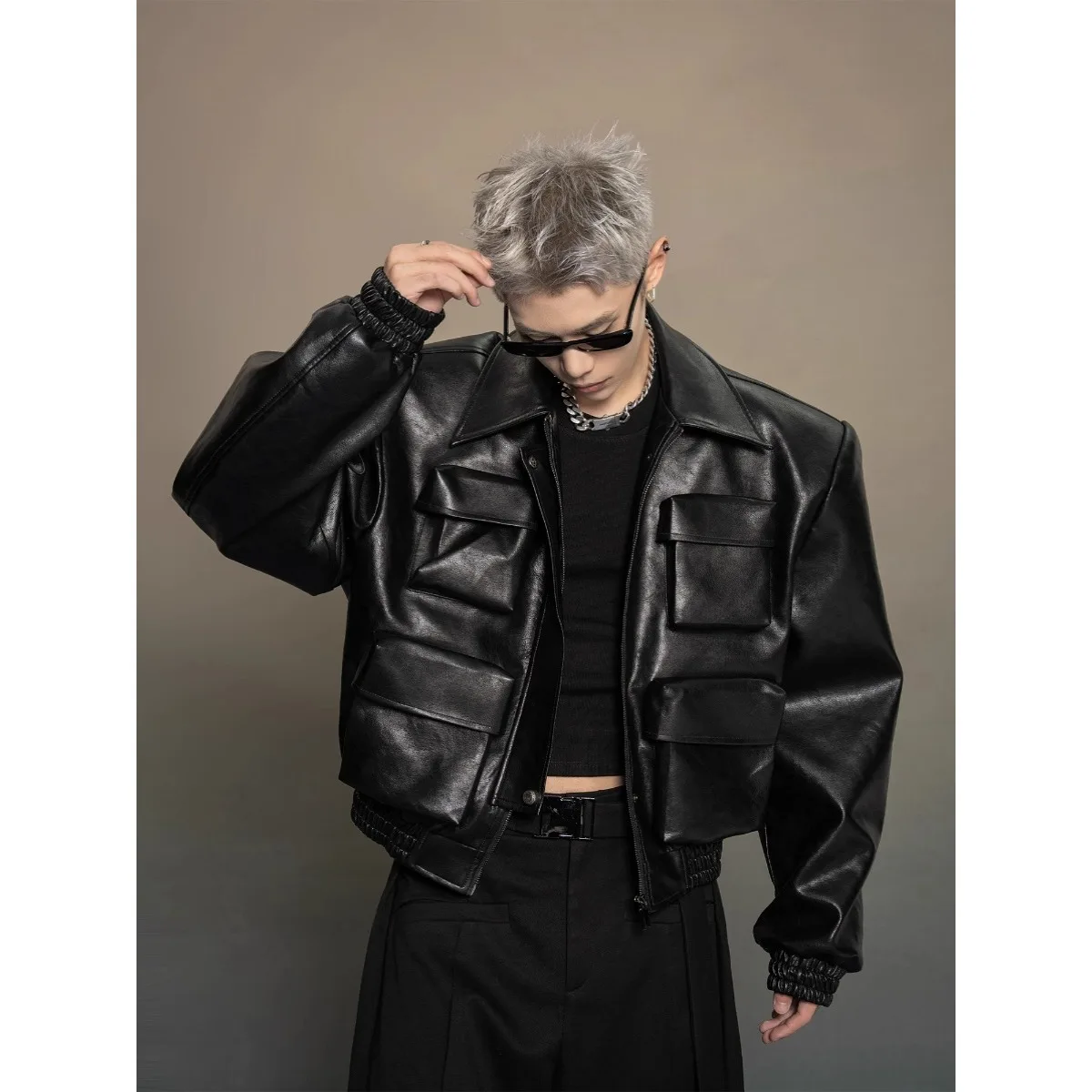 Y2K Mens PU Leather Jacket Pocket Motorcycle Coat Flip Collar Casual Gothic High Street Dark Silhouette Top Men's Wear 2025