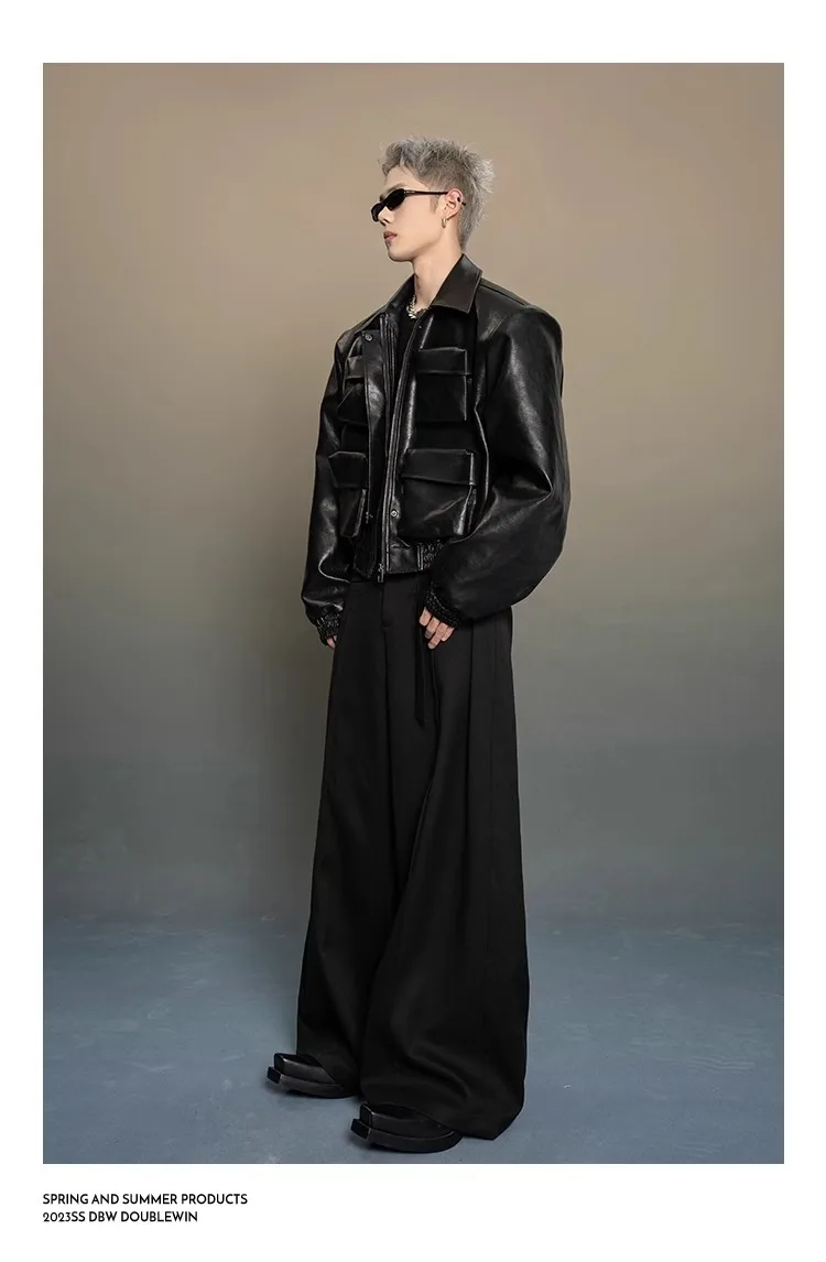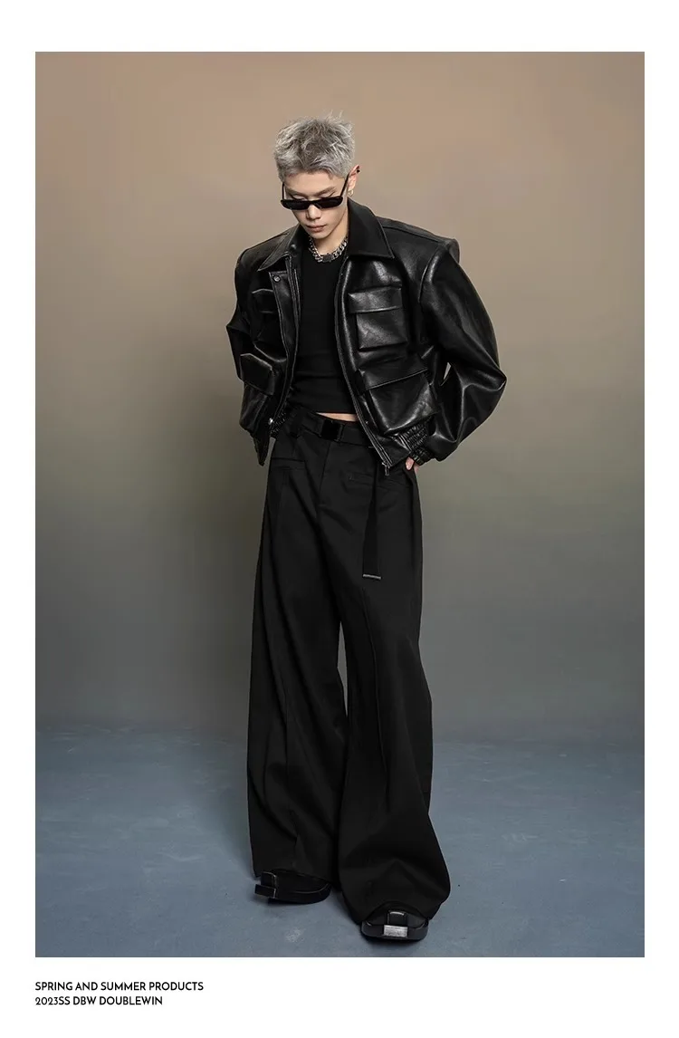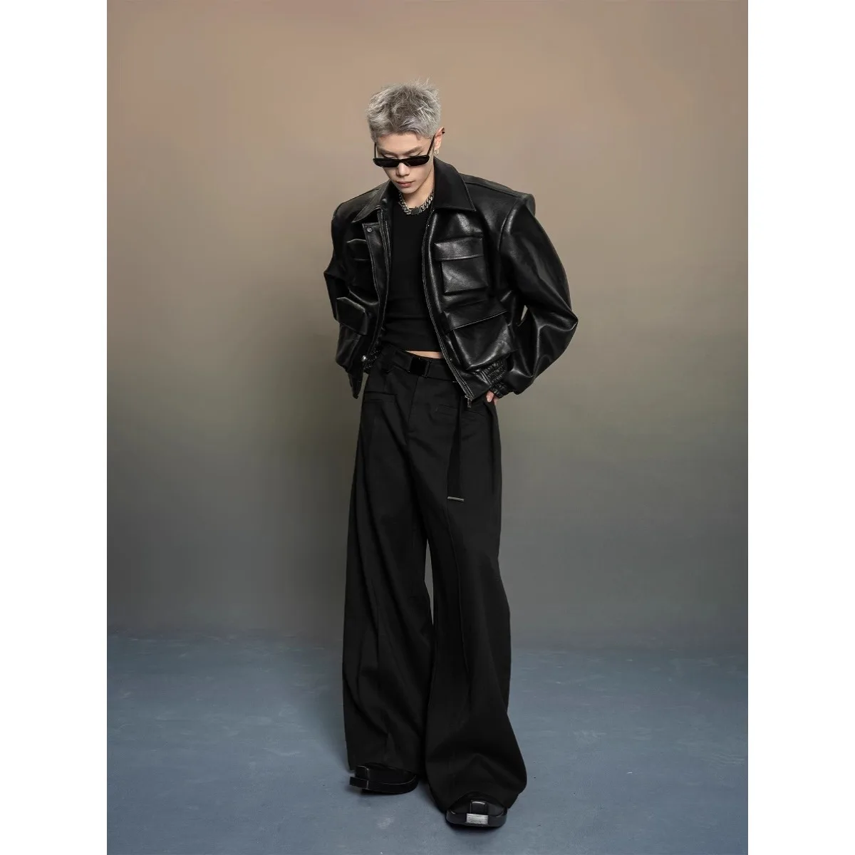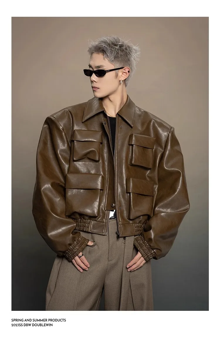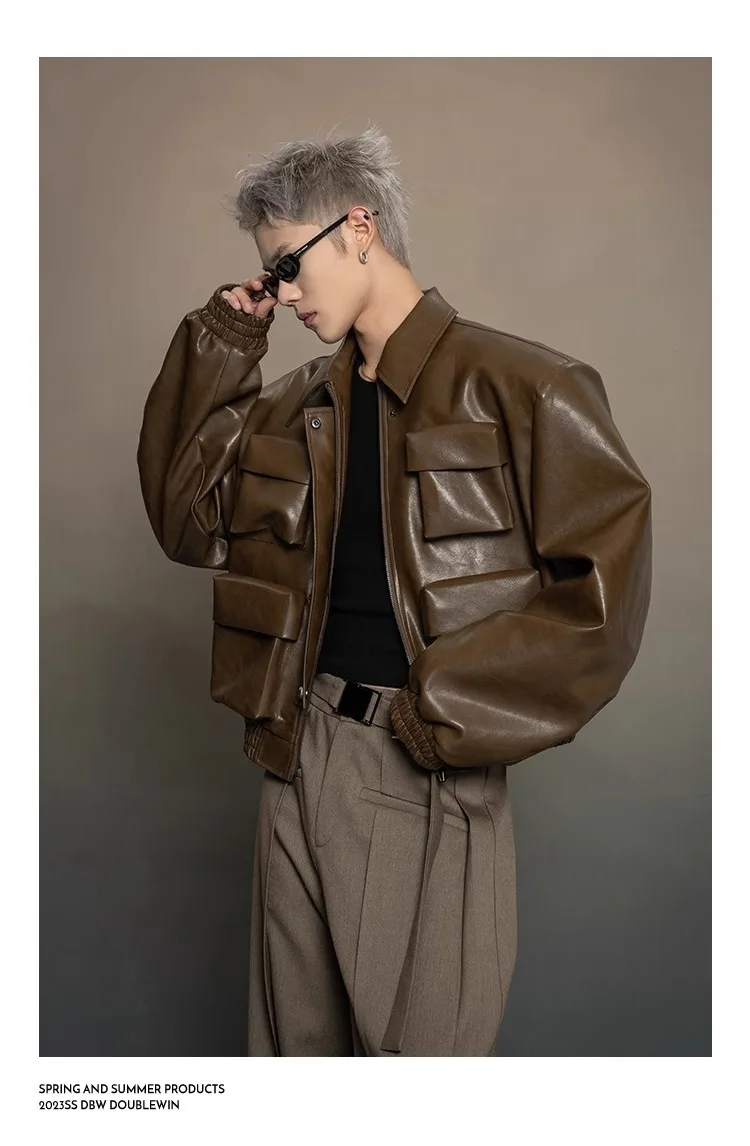 Y2K Mens PU Leather Jacket Pocket Motorcycle Coat Flip Collar Casual Gothic High Street Dark Silhouette Top Men's Wear 2025