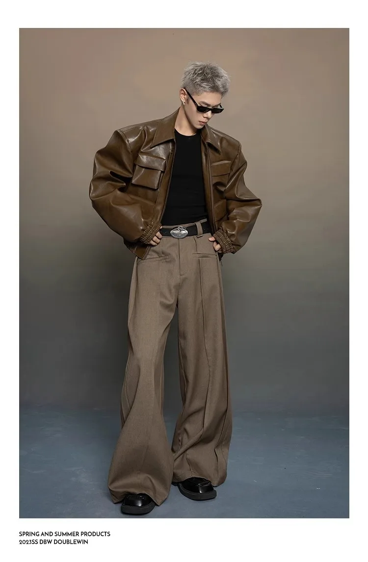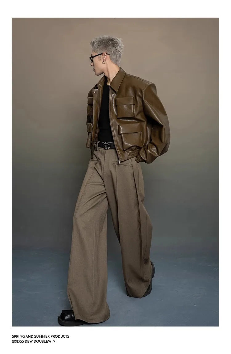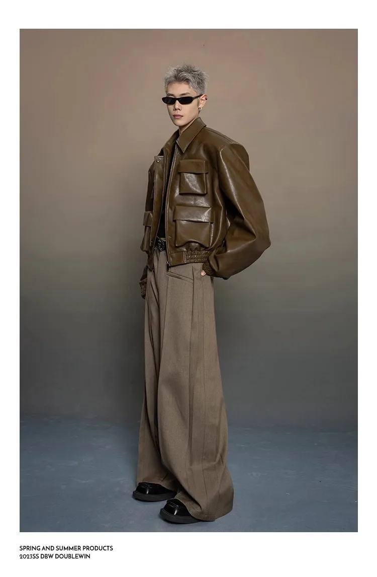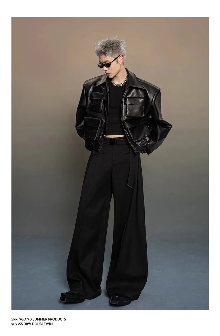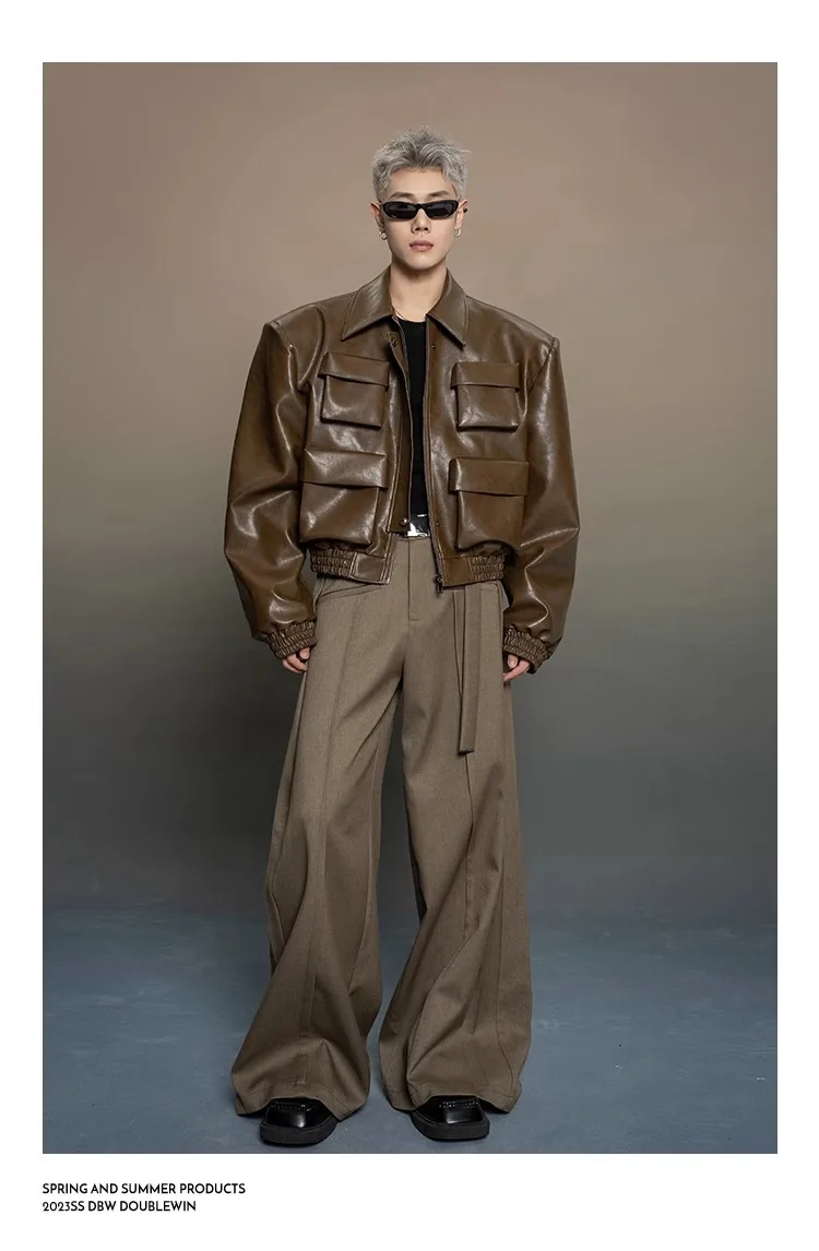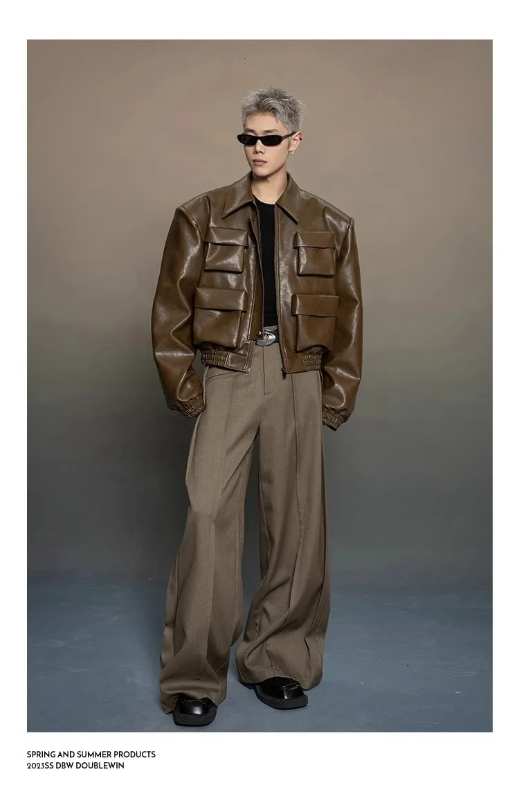 Y2K Mens PU Leather Jacket Pocket Motorcycle Coat Flip Collar Casual Gothic High Street Dark Silhouette Top Men's Wear 2025